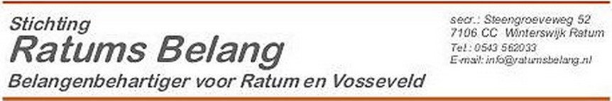 Het is al een tijd geleden dat u iets van Ratum- en Vossevelds Belang(verder RVB) hebt vernomen. Via Facebook en Twitter zijn we op social media actief, daar waar nodig.Volg ons: Twitter: @Ratums Belang of via de Facebookpagina Ratums Belang. Met deze nieuwsbrief informeren we u over wat er zich zoal de afgelopen periode heeft afgespeeld. Mocht u vragen hebben dan kunt u altijd contact opnemen via bovenstaand adres of één van de bestuursleden aanspreken.